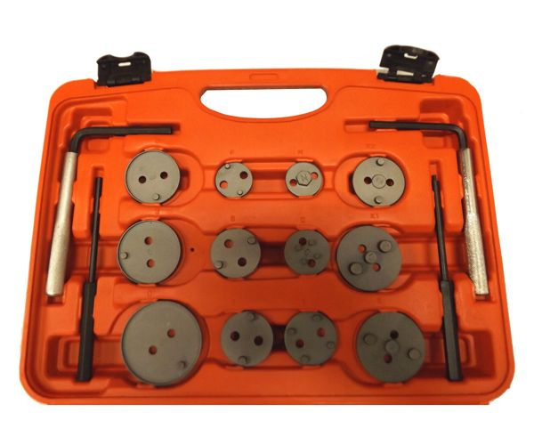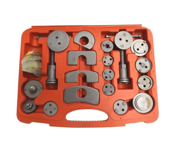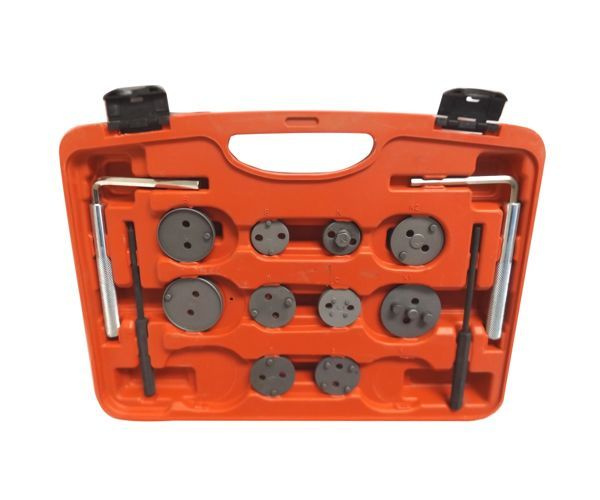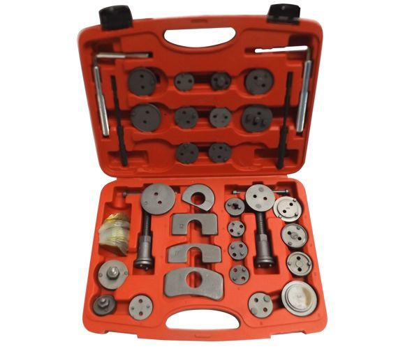 Zestaw do wkręcania tłoczka hamulcowego prawy lewy zawiera 35 sztuk narzędzi w tym 2 sztuki prasek (prawa lewa) do cofania tłoczka hamulcowego, klucz imbus 6 mm i 7mm, oraz dwa rodzaje wybijaków .
