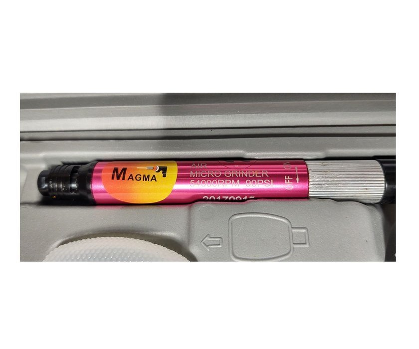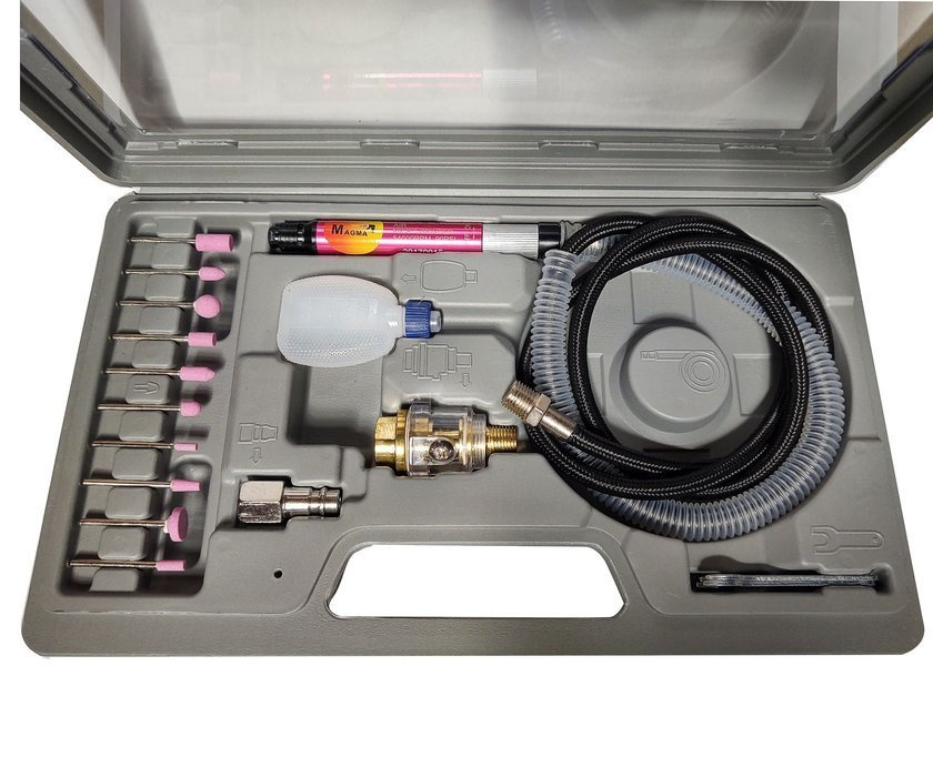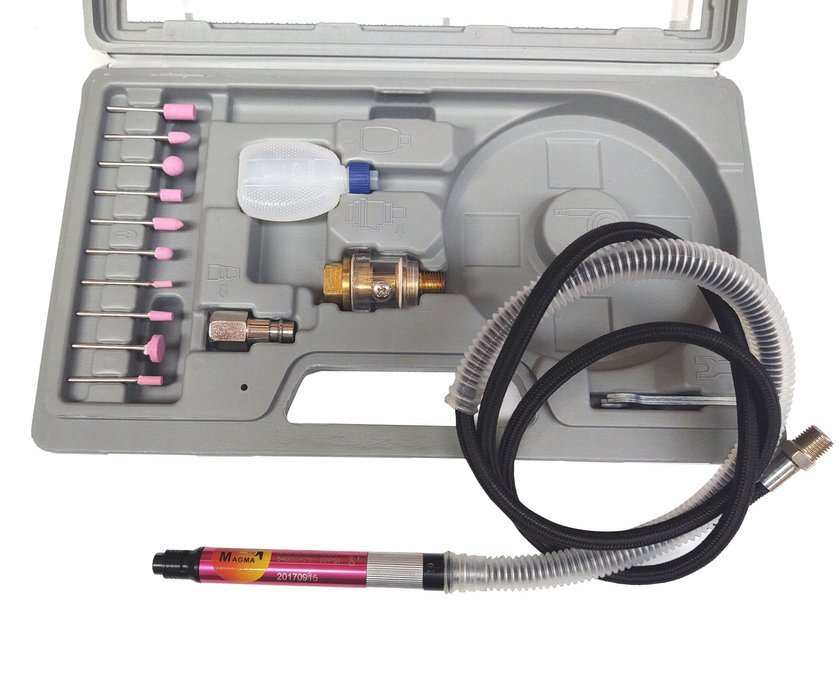 Szlifierka pneumatyczna z kamieniami marki Magma + 10 sztuk Kamienie walcowe na trzpieniu 5x10x3 granulacja 80.