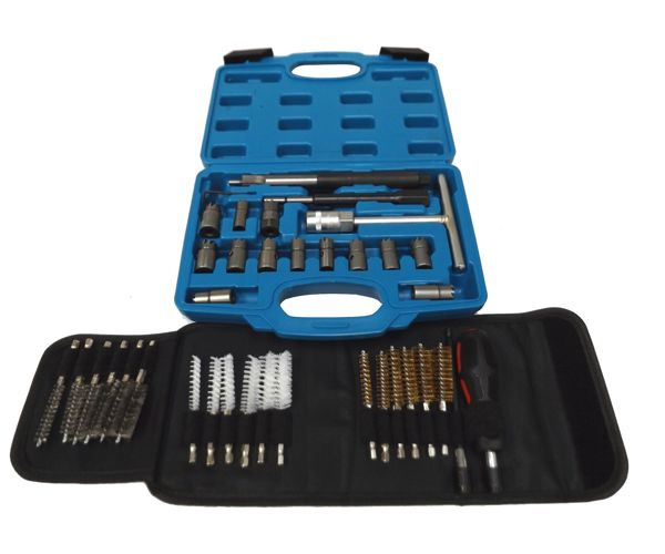 Zestaw szczotek przeznaczony do czyszczenia osadu węglowego m. in. z gniazd wtryskiwaczy.