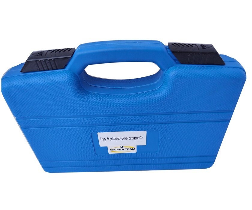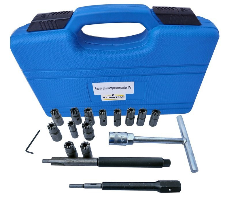 Zestaw frezów do gniazd wtryskiwaczy 17 elementów + szczotki do czyszczenia gniazd wtryskiwaczy marki Magma.