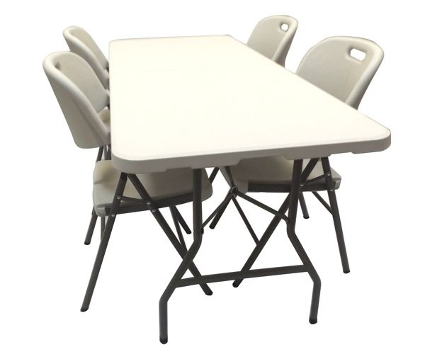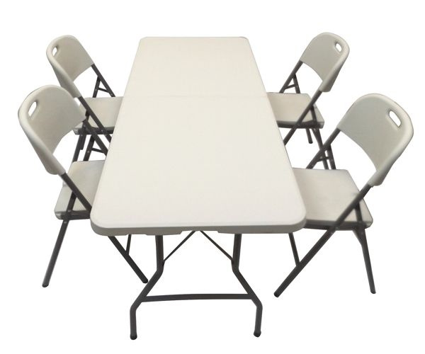 Wysokiej jakości stół składany 180cm i 4 krzesła. Zestaw idealny na grilla, biwak, piknik, do ogrodu, sadu czy na działkę. Można z niego korzystać zarówno wewnątrz, jak i na zewnątrz budynków. Prosty w użyciu, łatwo się składa. Wygodny w przechowywaniu i przenoszeniu dzięki wbudowanym uchwytom. Solidne i stabilne nogi o średnicy 25mm (model wzmocniony). Może być wykorzystywany przez firmy cateringowe. Stół wyposażony w blokadę przed przypadkowym złożeniem (dwa metalowe trzpienie).