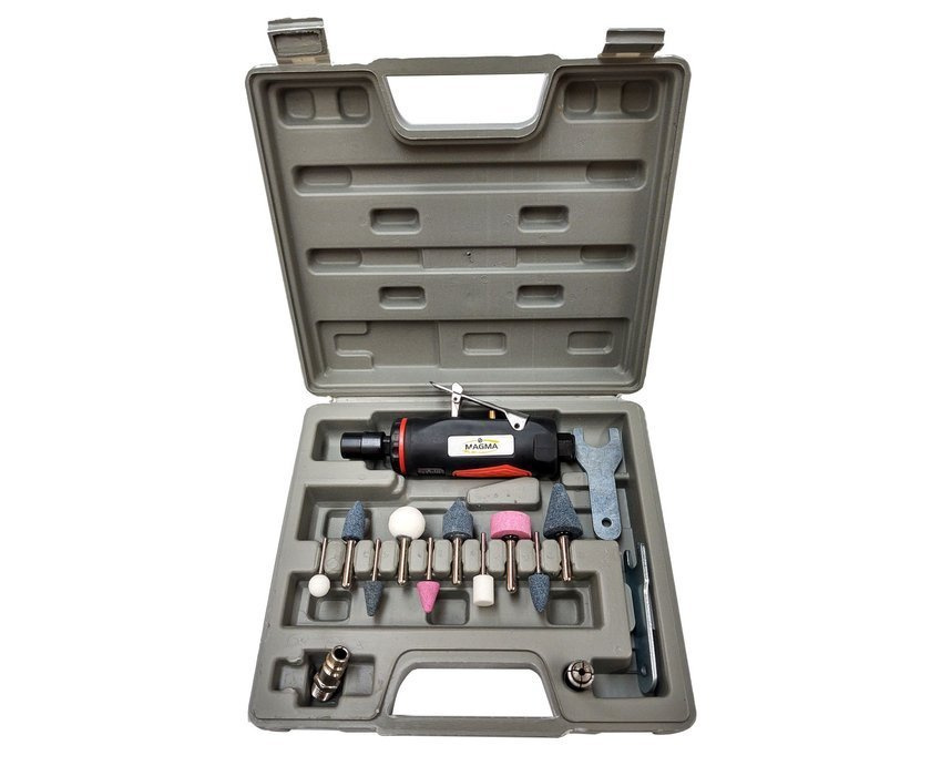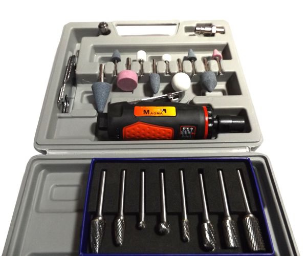 Mini szlifierka pneumatyczna Kit 1/4" model AT7032BK + 8 sztuk frezów HM pilników obrotowych marki Magma.
