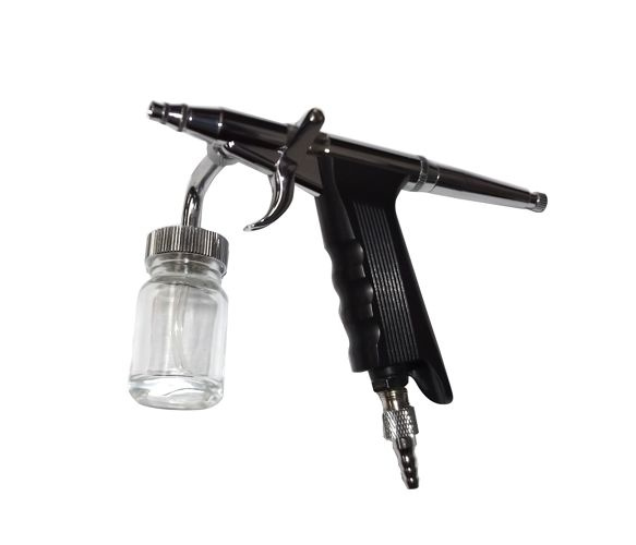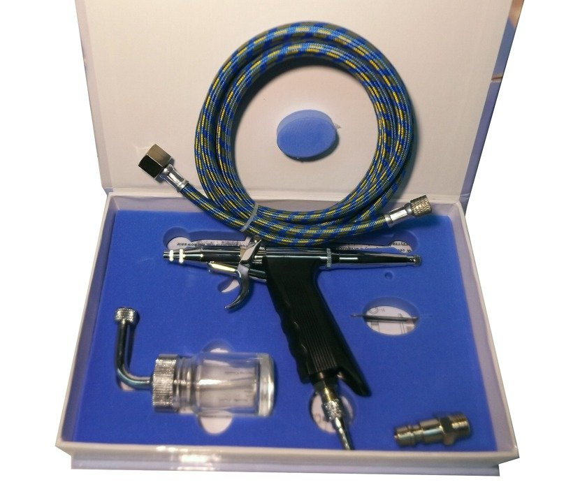 Nowy zestaw aerograf TG-116P ze zbiorniczkami szklanymi o pojemności 22cm3, wężyk i króciec GZ 1/4" do kompresora.