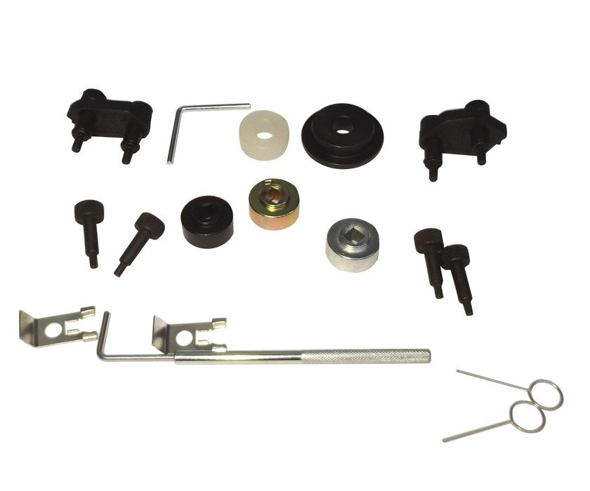 Zestaw służy do ustawiania wałka rozrządu podczas wymiany paska lub łańcucha rozrządu w silnikach benzynowych oraz montowanych w samochodach marek: VW, Audi.