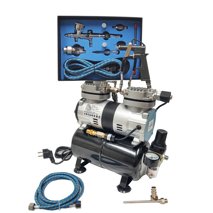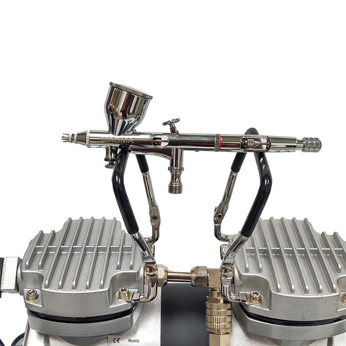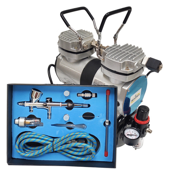 Zestaw aerograf AB-180K z dyszami 0,2; 0,3 oraz 0,5 i kompresor z butlą dwutłokowy do aerografii marki Magma.