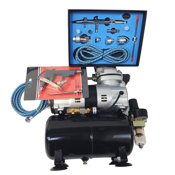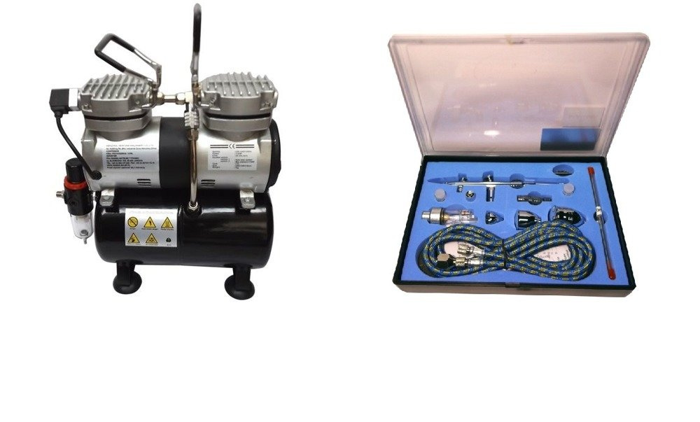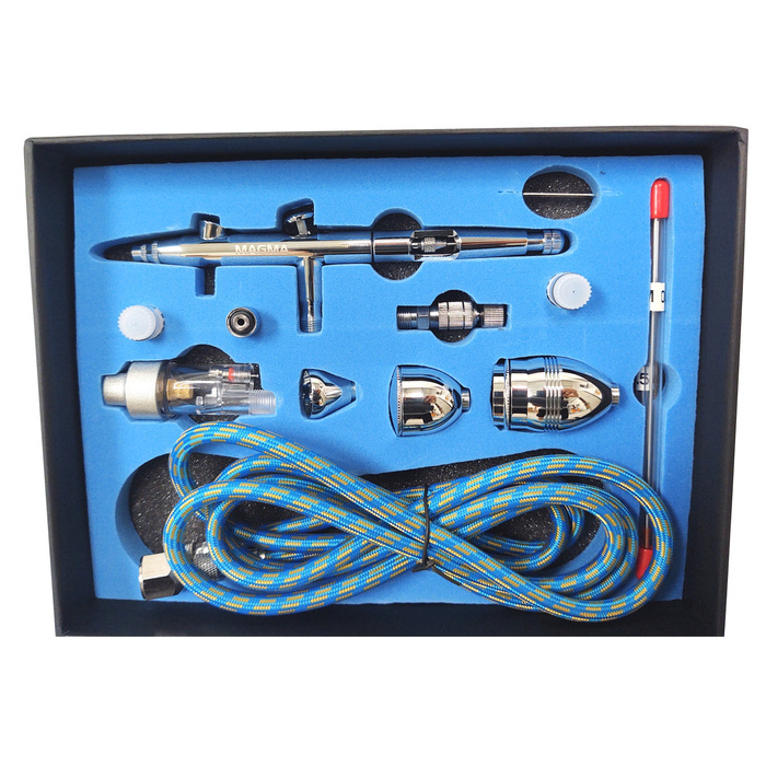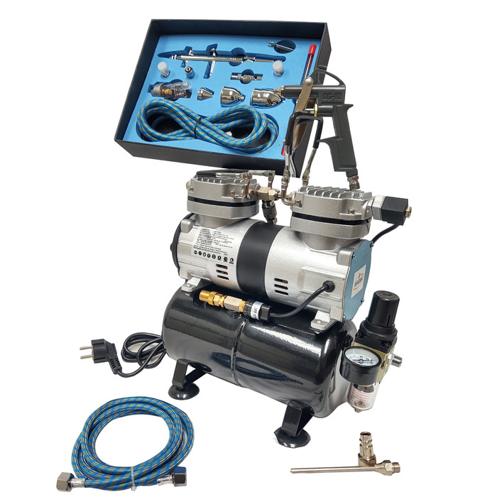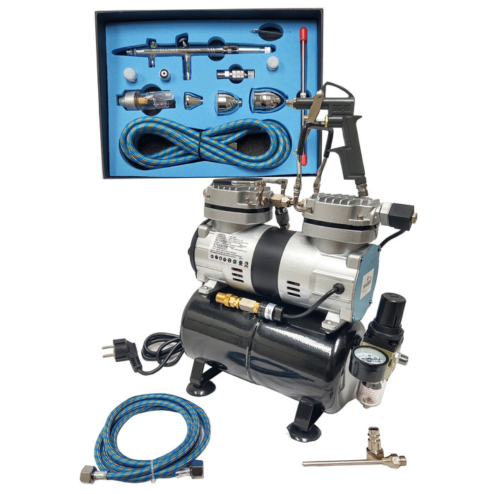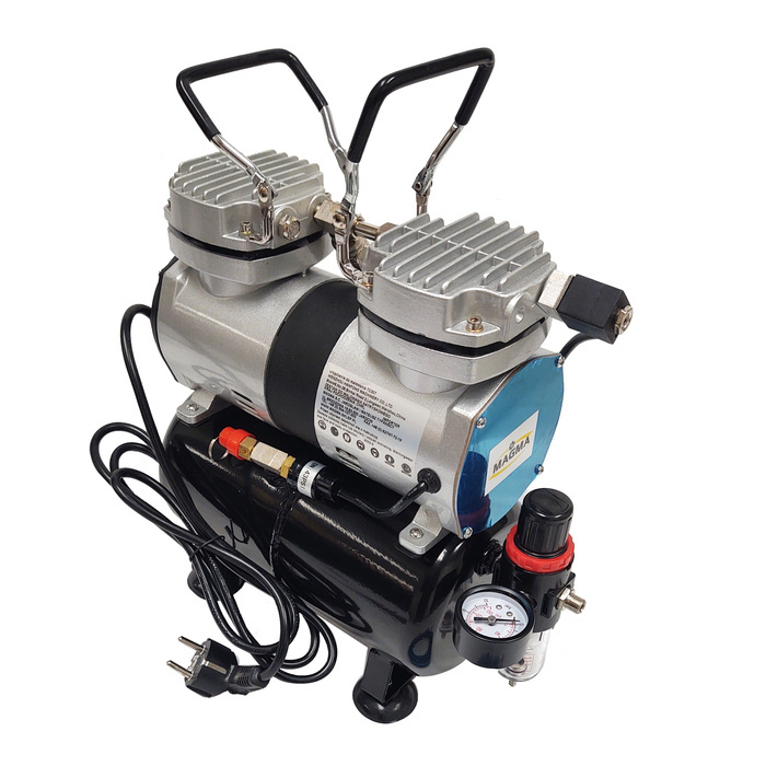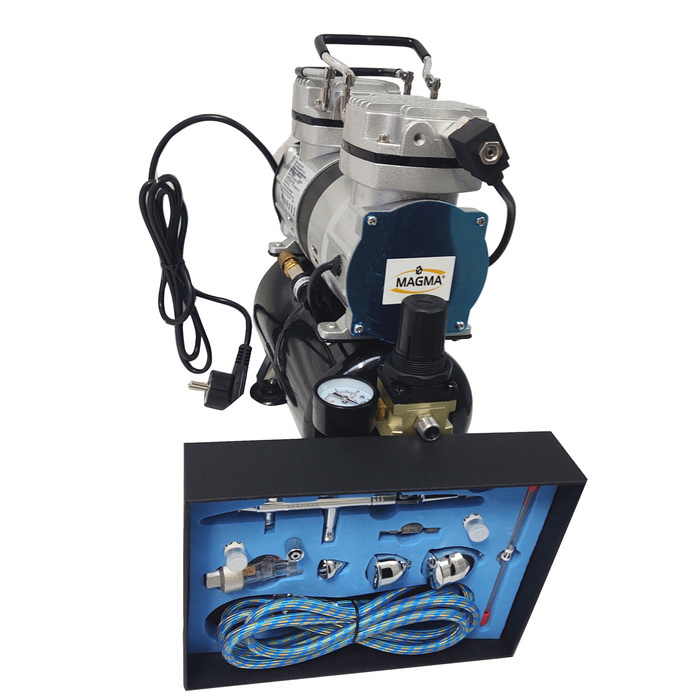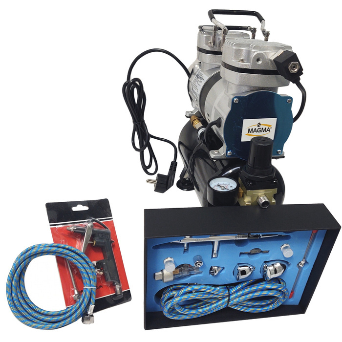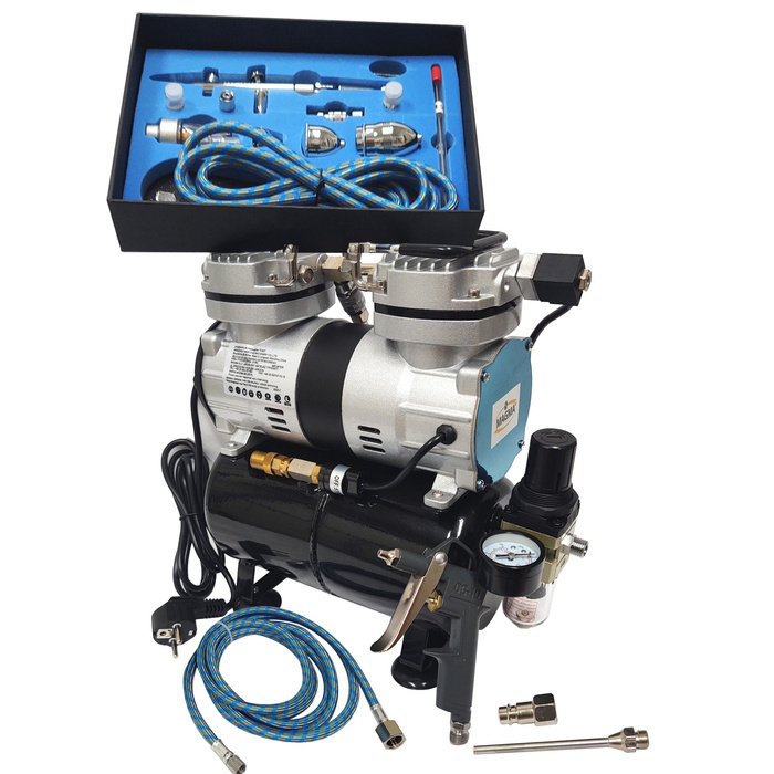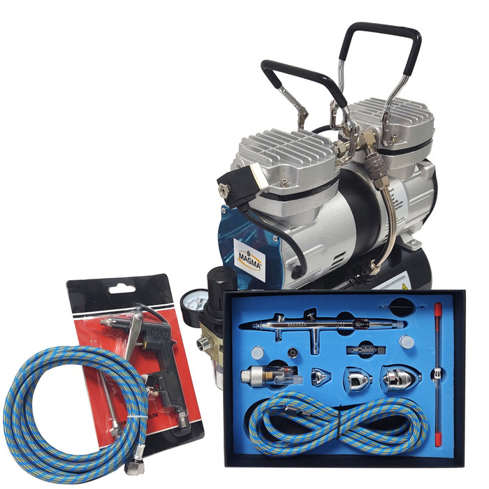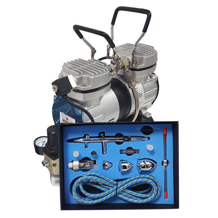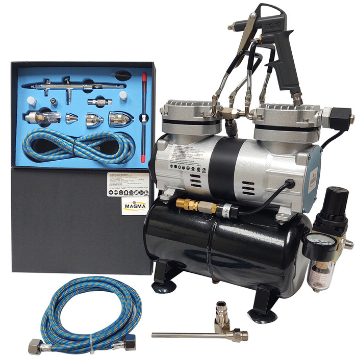Zestaw aerograf AB-186K z dyszami 0,2; 0,3 oraz 0,5 i kompresor z butlą dwutłokowy do aerografii marki Magma.
