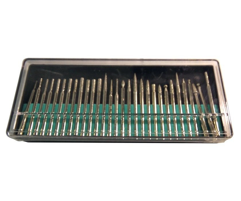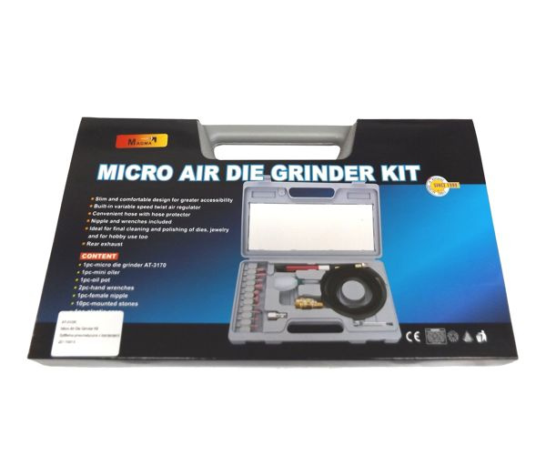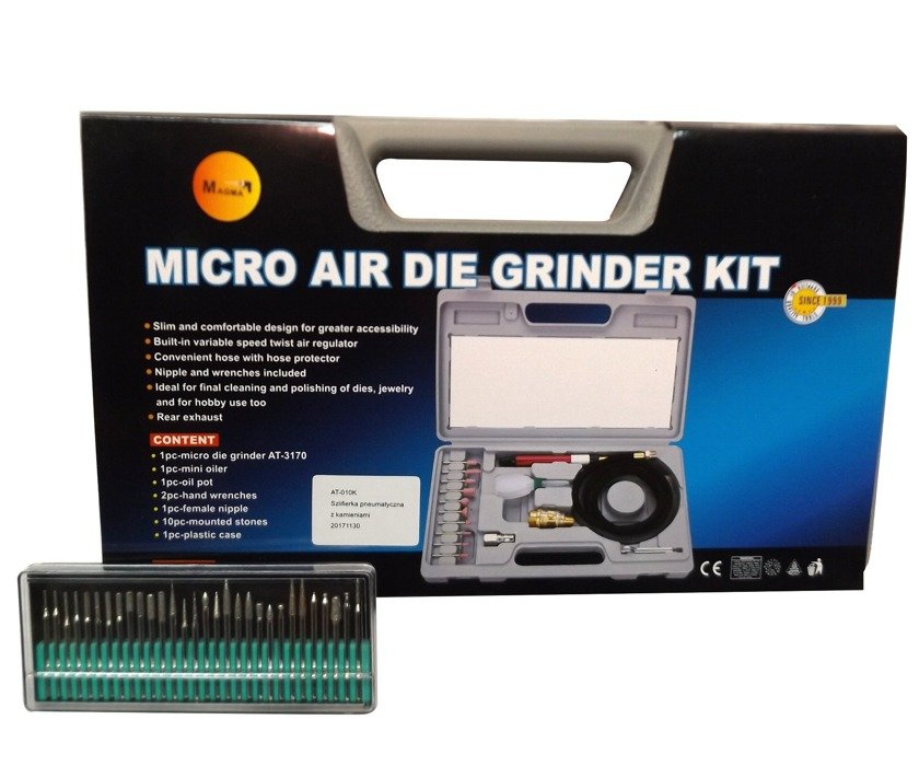 Szlifierka pneumatyczna trzpieniowa mini z kamieniami model AT010K + zestaw frezów trzpieniowych 3mm model GPS30 marki Magma.