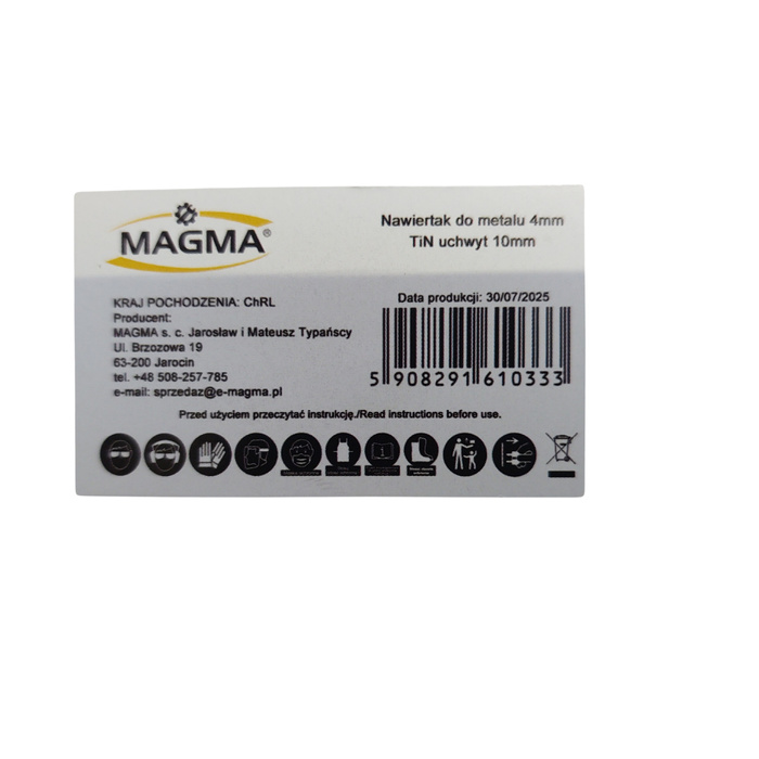 ProducentMAGMA s.c. Jarosław i Mateusz TypańscyAdres: Brzozowa 19Kod pocztowy: 63-200Miasto: JarocinKraj: PolskaNumer telefonu: 508-257-785Adres email: sprzedaz@e-magma.plOpis: Informacja o bezpieczeństwie znajduje się w załączniku w instrukcji zamieszczonej w ogłoszeniu oraz w treści oferty i na zdjęciach produktu.