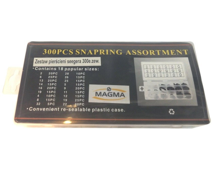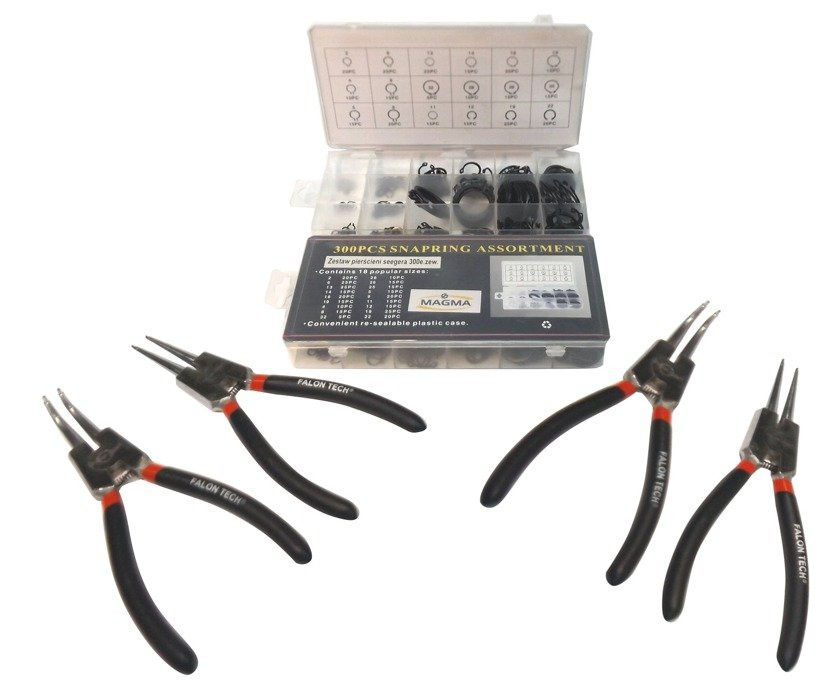 Zestaw składa się z kompletu szczypiec do pierścieni Seegera o wysokiej jakości wykonania oraz 300 sztuk pierścieni zewnętrznych.