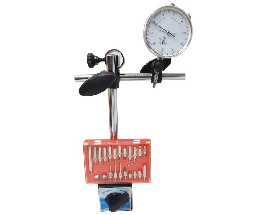 Zestaw końcówek przedłużki czujnika zegarowego 22el. + czujnik zegarowy 107-601-105 ze statywem 0-10mm marki Magma.