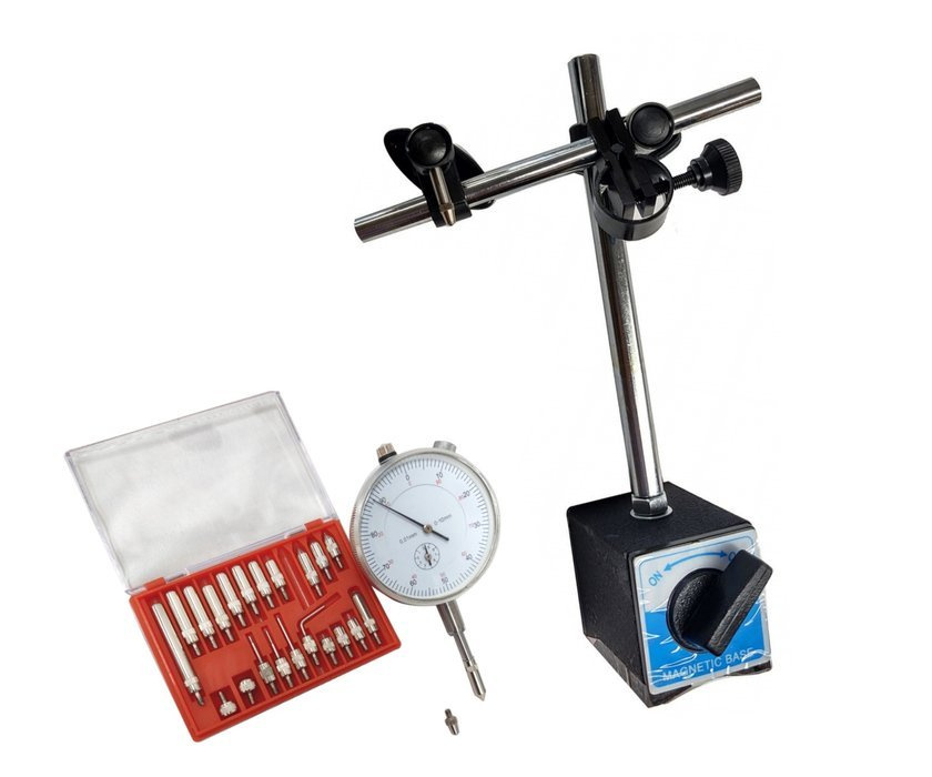 Końcówki przedłużki czujnika zegarowego 22el.+ czujnik zegarowy 10mm magnetyczny + statyw w kartoniku