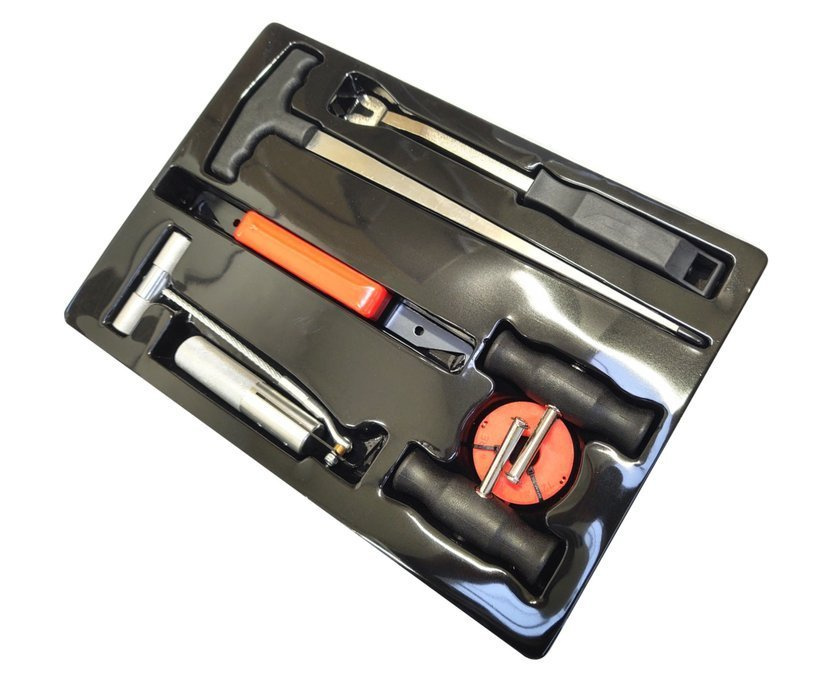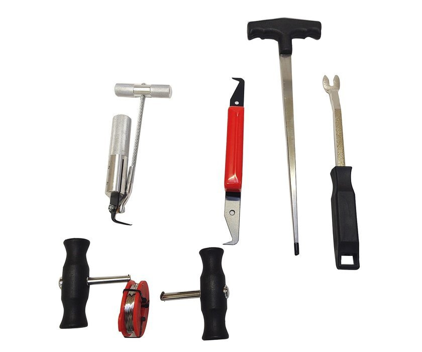 Uniwersalny zestaw do wycinania szyb samochodowych(każda marka), składa się z siedmiu elementów zapewniających prawidłowe przeprowadzenie zabiegu wycinania szyby.