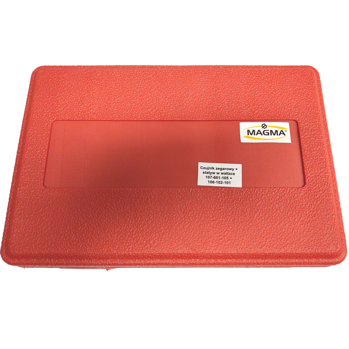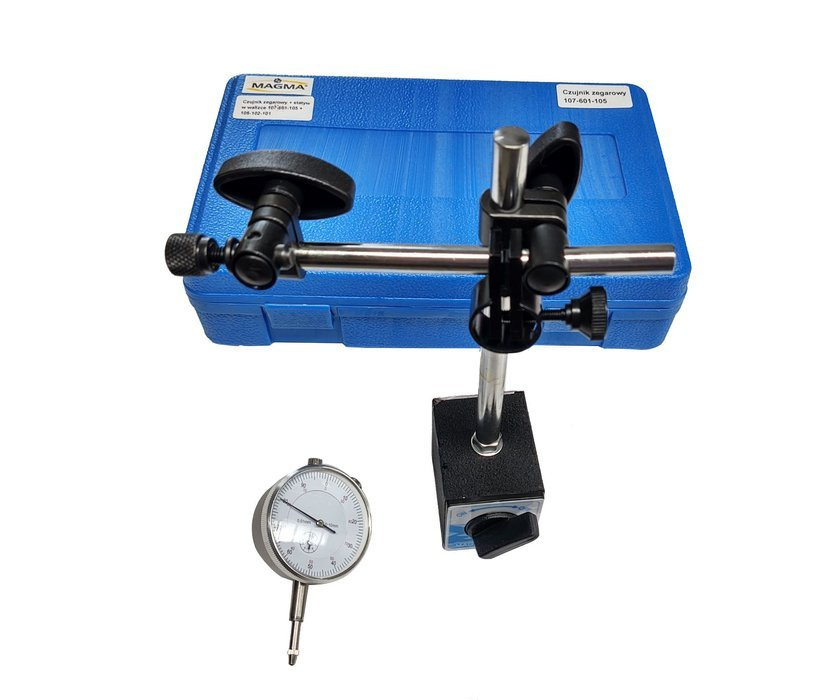 Zestaw czujnik zegarowy 107-601-105 ze statywem 0-10mm 106-102-101 w walizce marki Magma.
