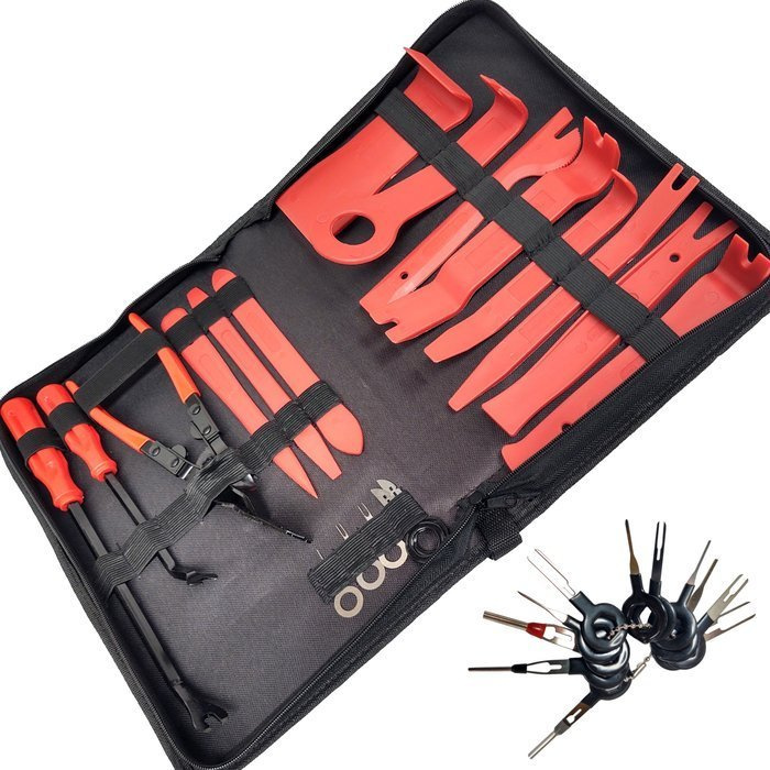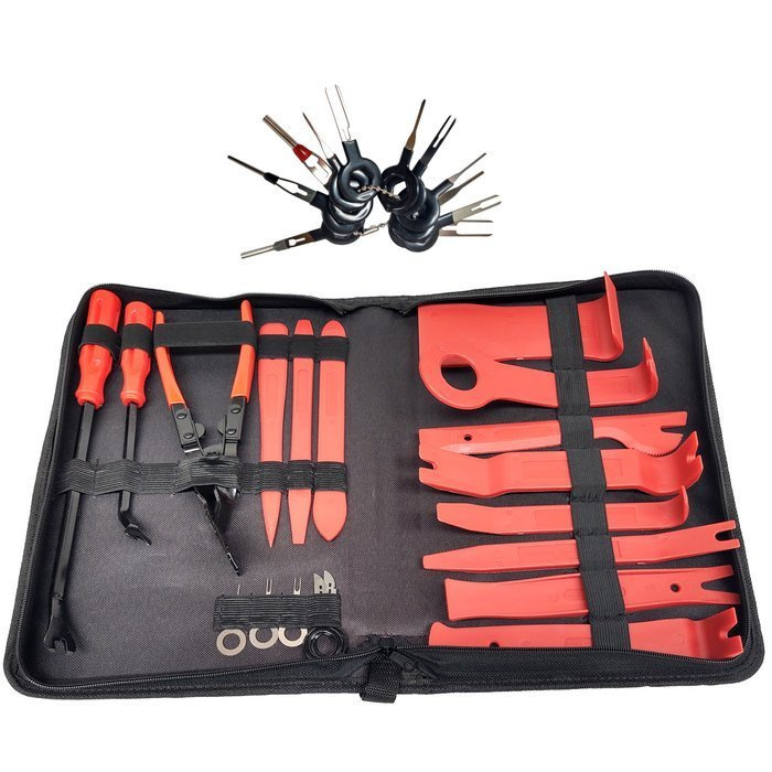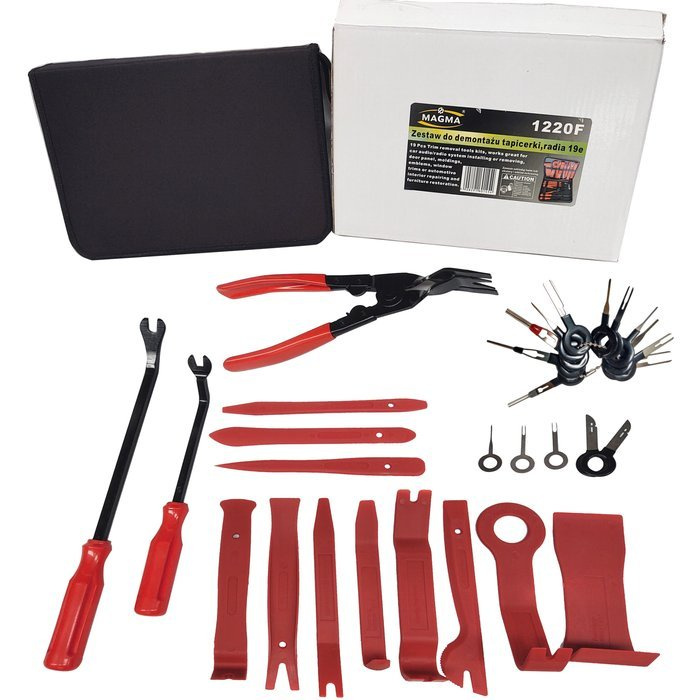 Ściągacz do tapicerki, radia 19e. 1220F + zestaw kluczy do demontażu pinów wyjmaki i złączy instalacji elektrycznych marki Magma.