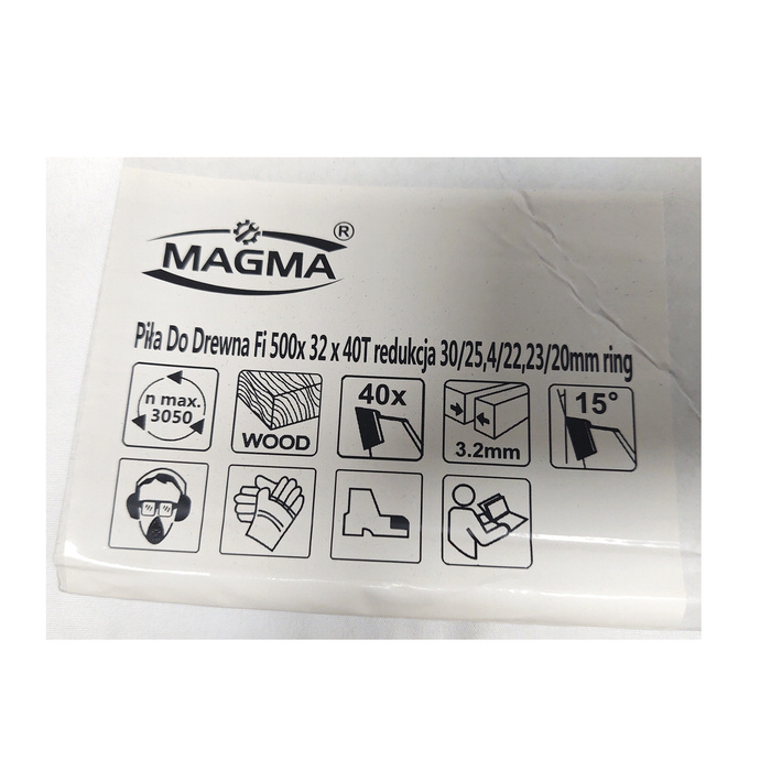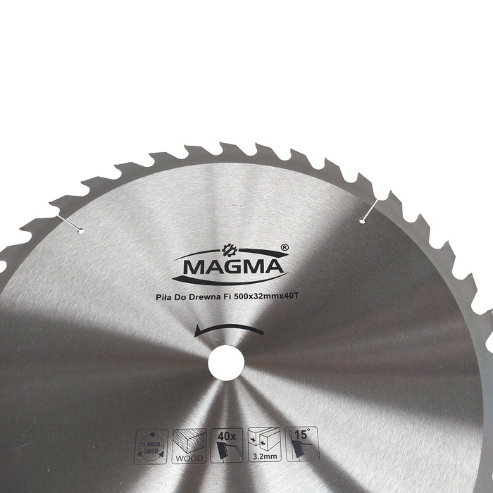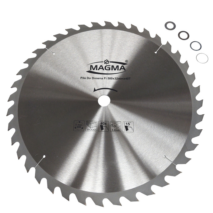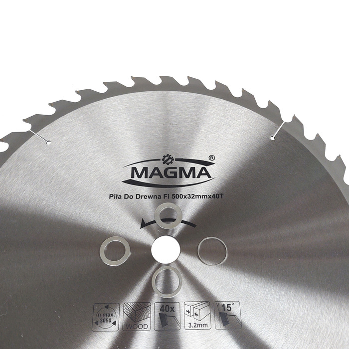 Piła widiowa do drewna 500 mm 40T zębna z otworem 32 mm redukcja na 30 mm, 25,4 mm, 22,23 mm, 20 mm marki Magma.