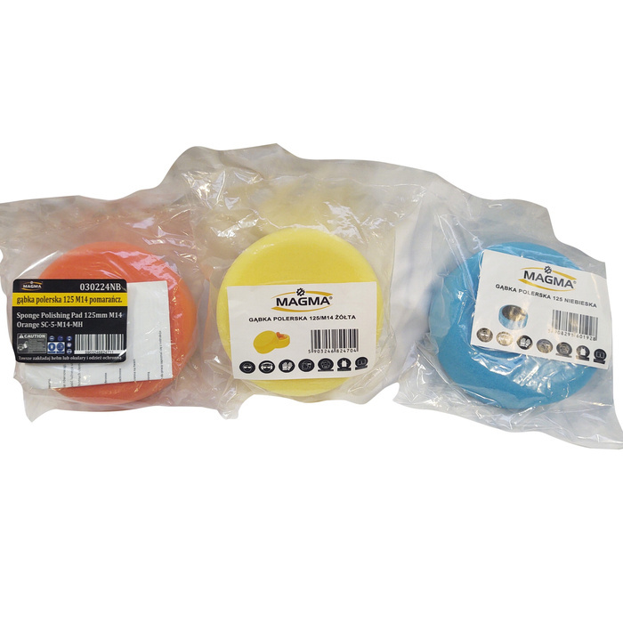Zestaw gąbek 125mm 3 szt: pomarańczowa + żółta + niebieska i trzpień M14 marki Magma.