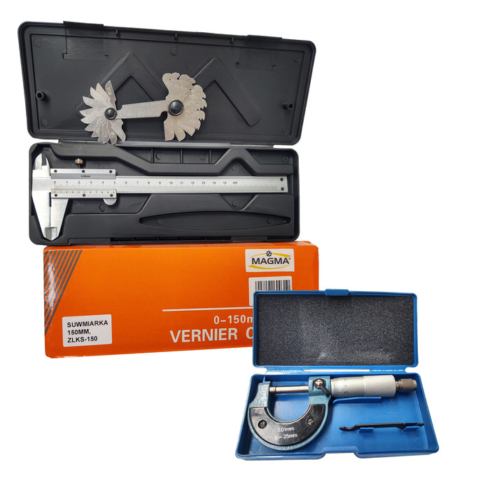 Suwmiarka 150mm 0.02 ZLKS-150 + Grzebień do gwintów 60° 24 listki + Mikrometr 0-25mm marki Magma.