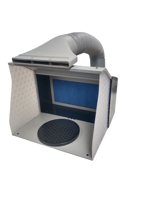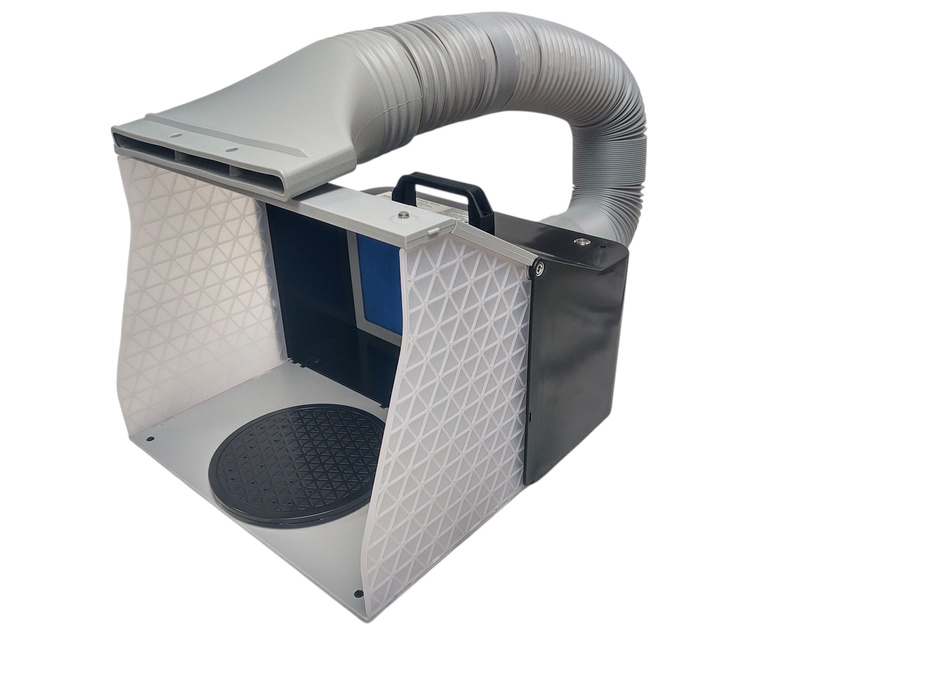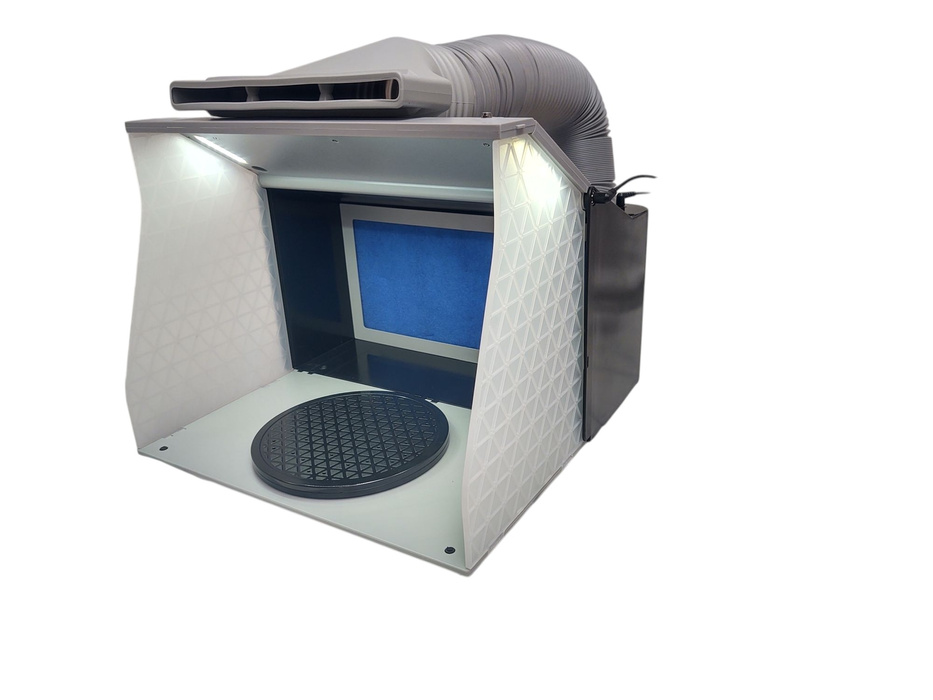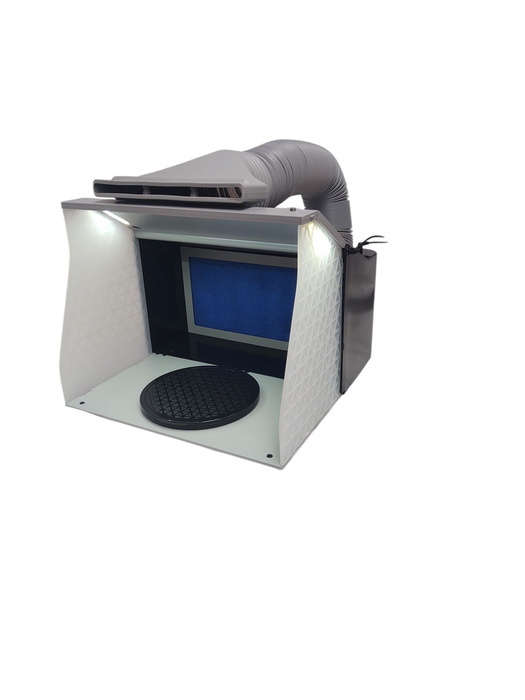 Profesjonalnie wykonana kabina malarska przeznaczona do malowania elementów mini pistoletami lakierniczymi oraz aerografami. Posiada obrotową platformę pozwalającą na wygodnie malowanie przedmiotów bez brudzenia rąk.