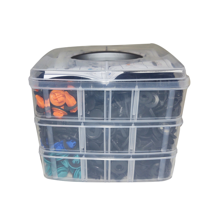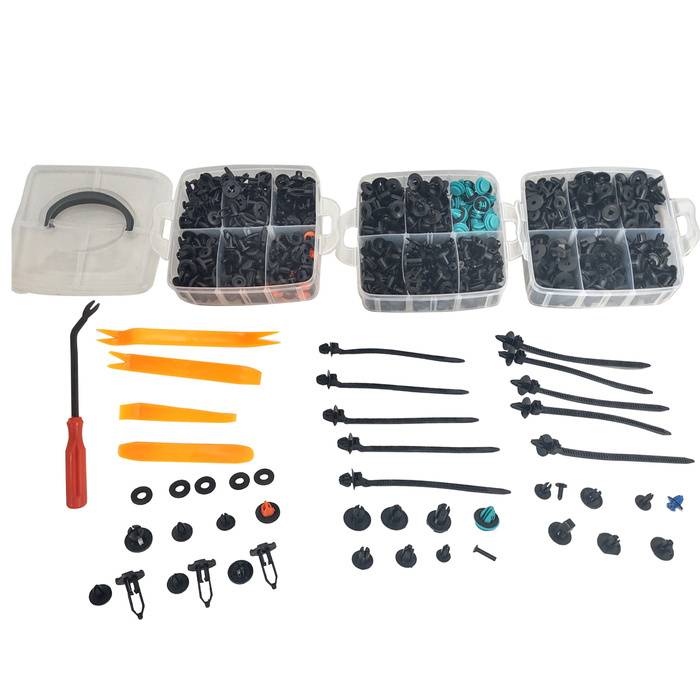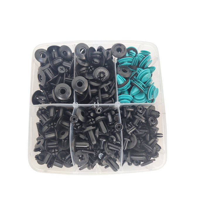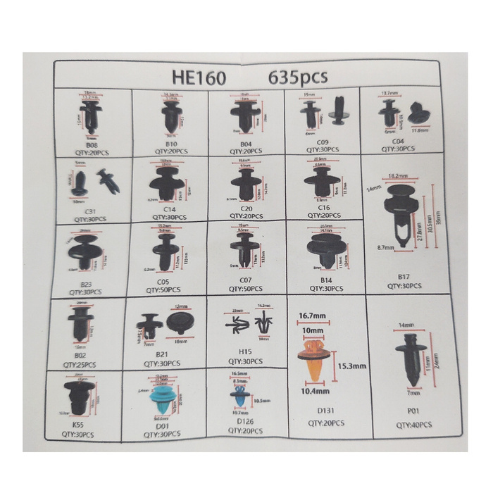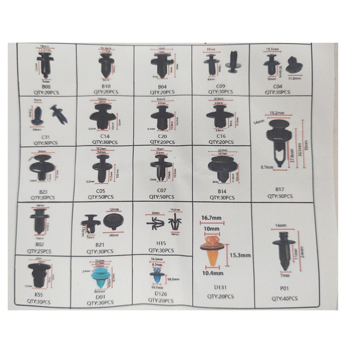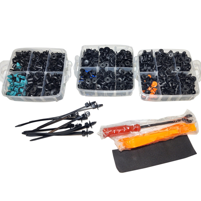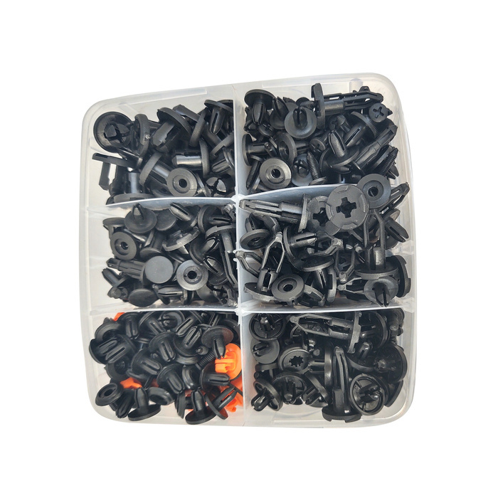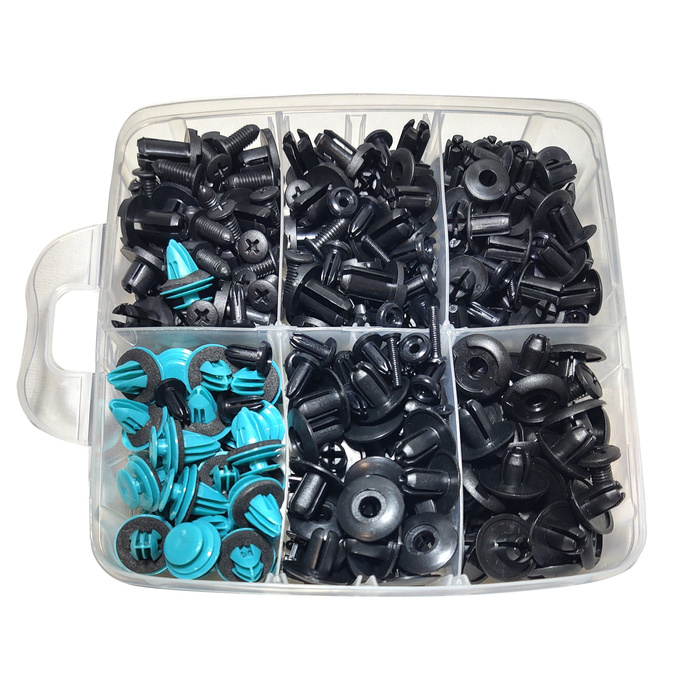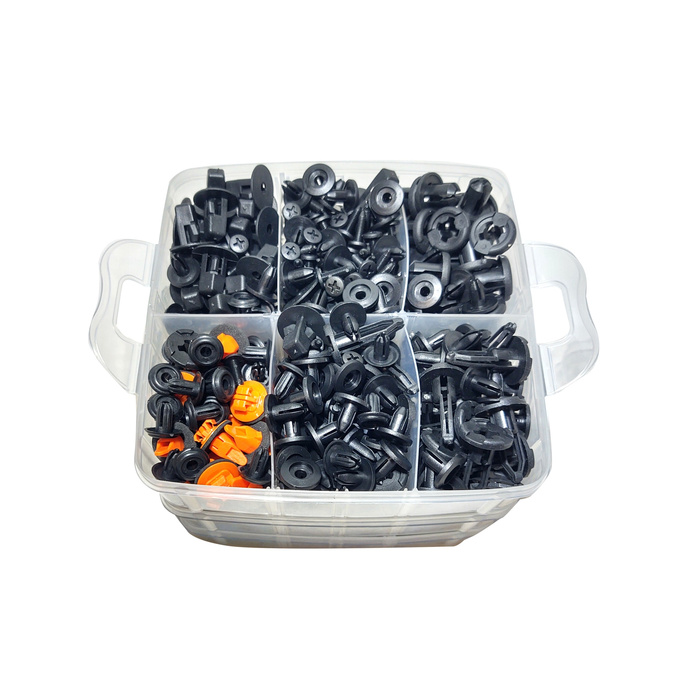 Zestaw zawiera różne rodzaje spinek, kołków i klipsów, które znajdą zastosowanie każdym samochodzie.