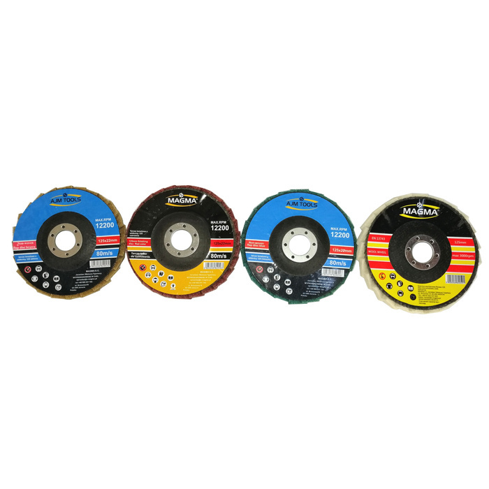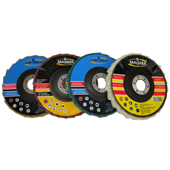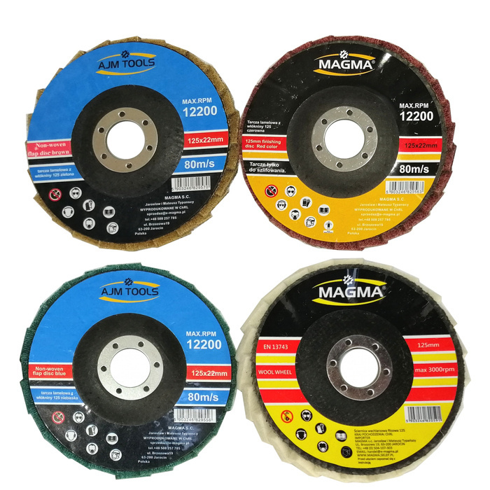 Zestaw tarcz lamelowa z włókniny 125 zielona czerwona niebieska szlifowania polerowania włóknina lamelka + tarcza filcowa 125 ściernica wachlarzowa filc SC-W125D marki Magma.