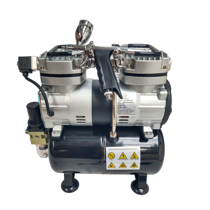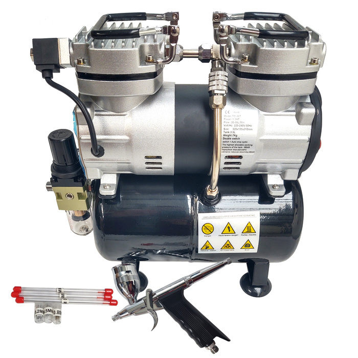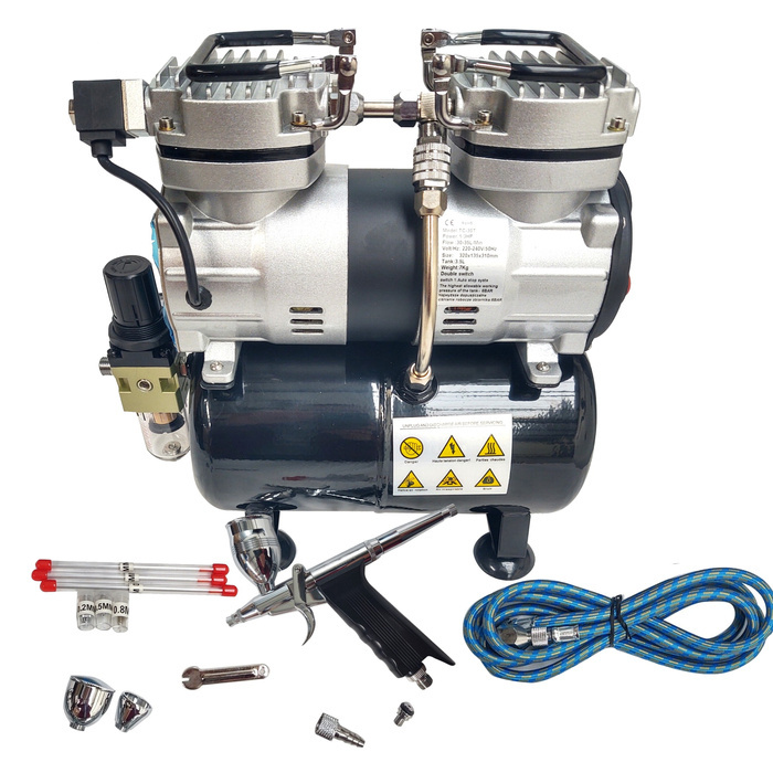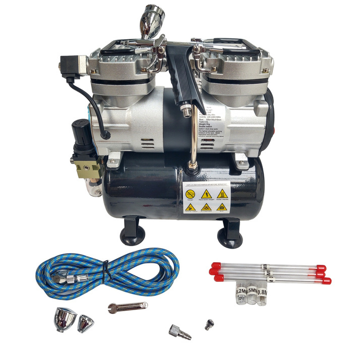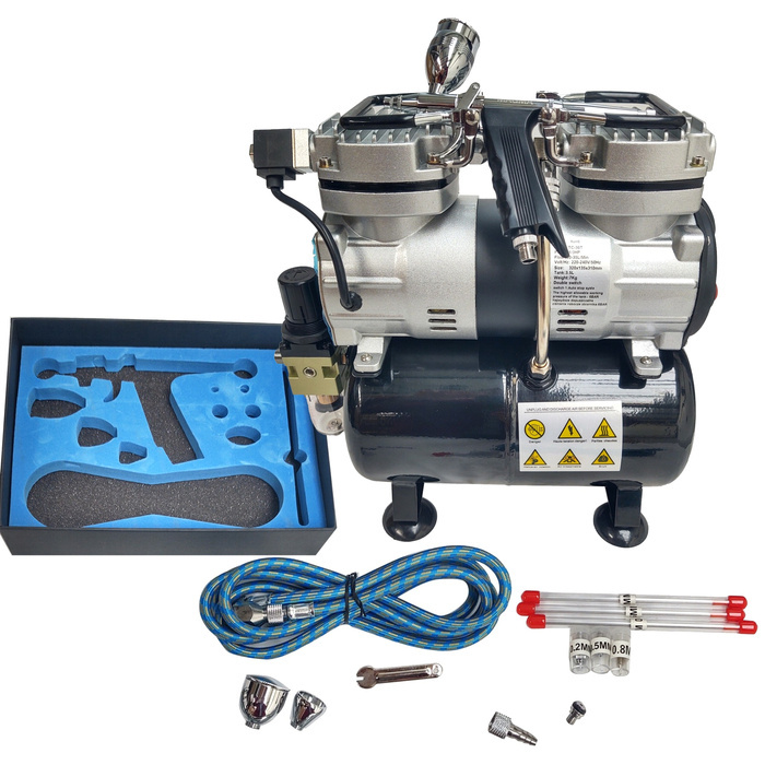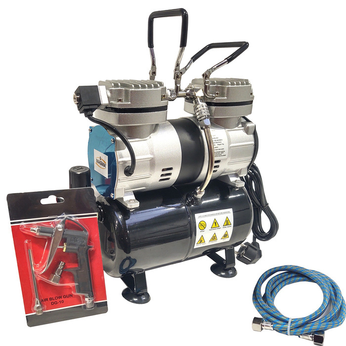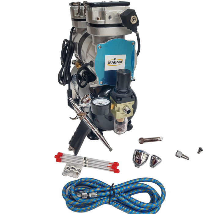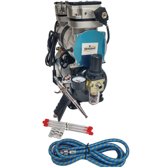 Zestaw aerograf AB-116 3 zbiorniki 4 dysze i kompresor z butlą dwutłokowy do aerografii marki Magma.
