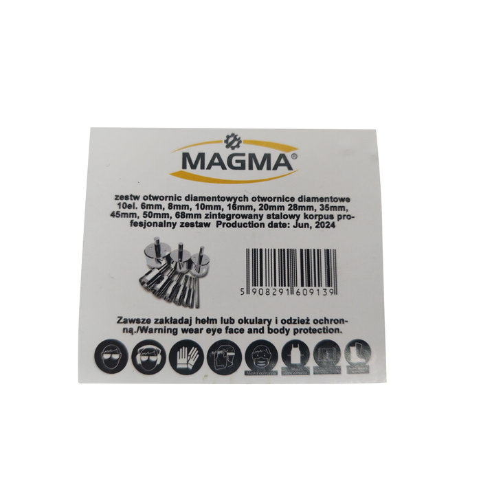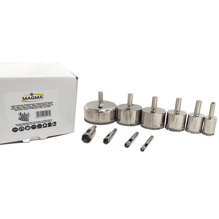 Zestaw otwornic diamentowych otwornice diamentowe 10 el. 6mm, 8mm, 10mm, 16mm, 20mm 28mm, 35mm, 45mm, 50mm, 68mm zintegrowany stalowy korpus profesjonalny zestaw marki Magma.