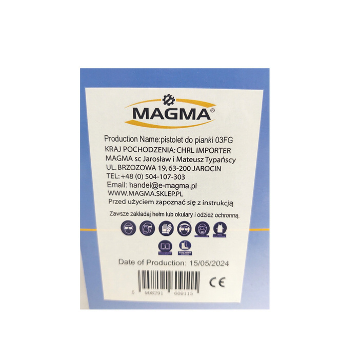 ProducentMAGMA s.c. Jarosław i Mateusz TypańscyAdres: Brzozowa 19Kod pocztowy: 63-200Miasto: JarocinKraj: PolskaNumer telefonu: 508-257-785Adres email: sprzedaz@e-magma.plOpis: Informacja o bezpieczeństwie znajduje się w załączniku w instrukcji zamieszczonej w ogłoszeniu oraz w treści oferty i na zdjęciach produktu.