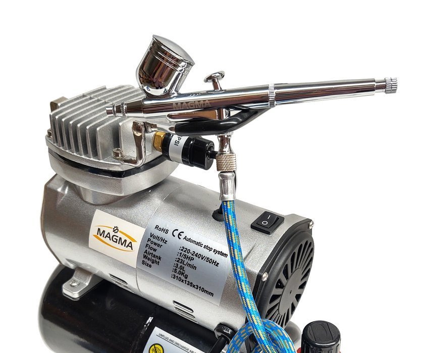 Zestaw kompresor z butlą oraz Aerograf AB-130 z dyszą 0,3 marki Magma.