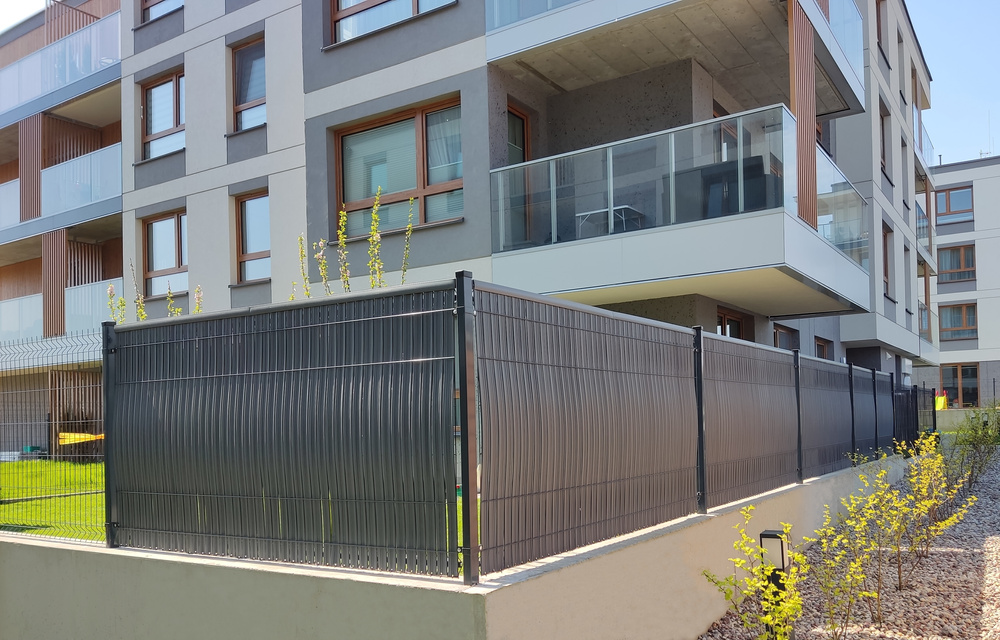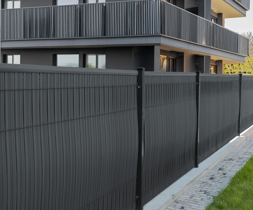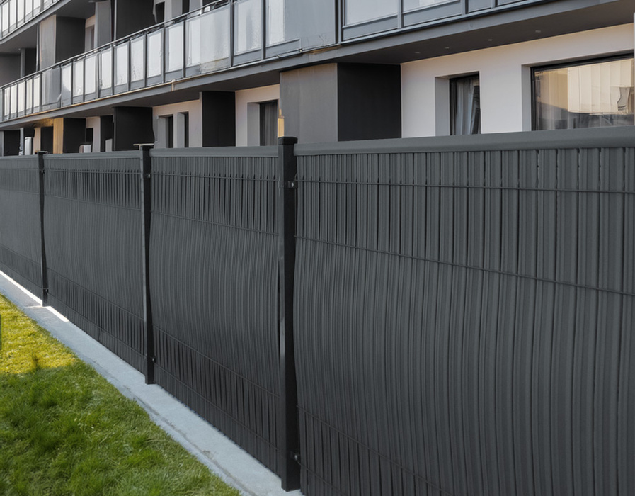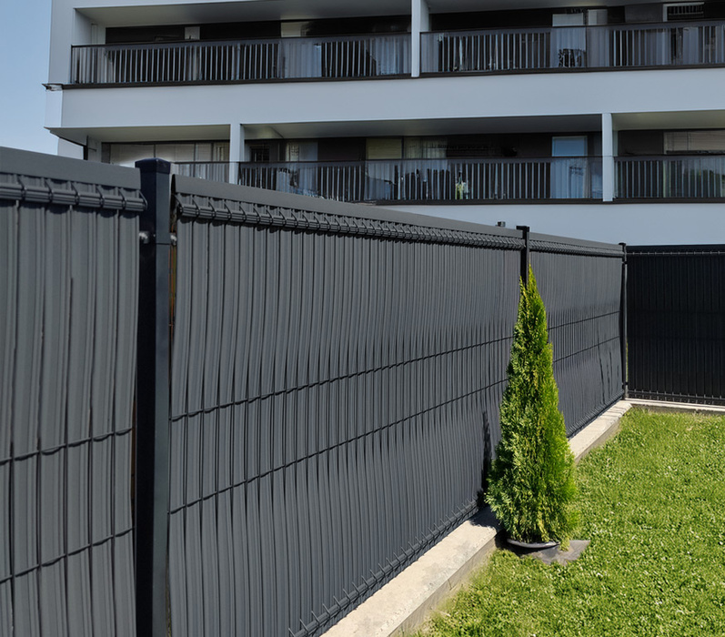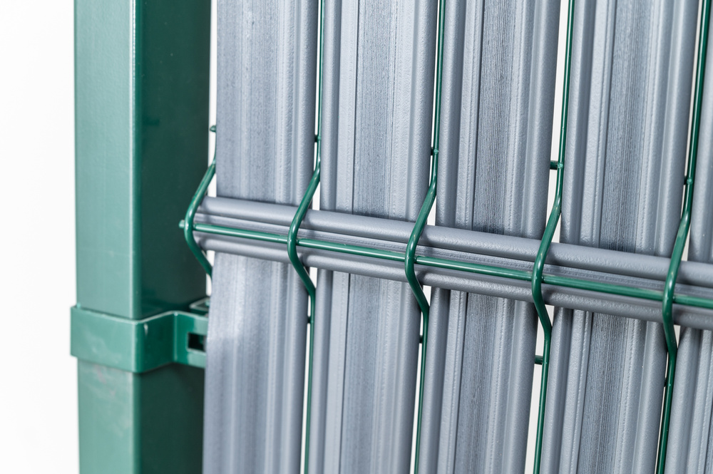 - Osłona w postaci listew z tworzywa sztucznego wsuwanych w ogrodzenie panelowe do samodzielnego montażu.